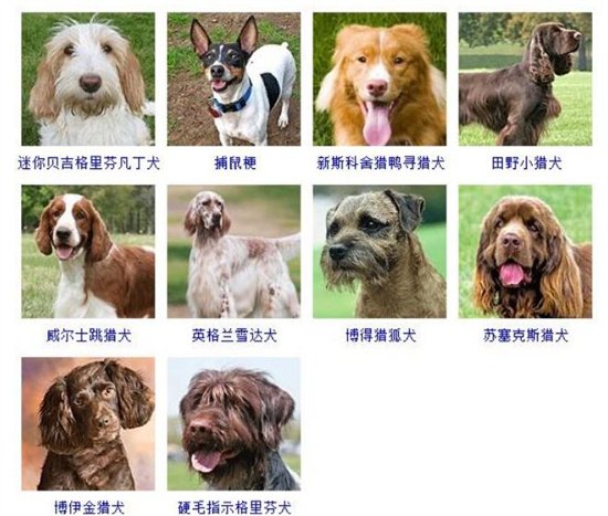 15、迷你而吉格里芬凡丁犬、捕鼠梗、新斯科舍獵鴨尋獵犬、田野小獵犬、威爾士跳獵犬、英格蘭雪達犬、搏得獵狐犬、蘇塞克斯獵犬、硬毛指示格里芬犬。