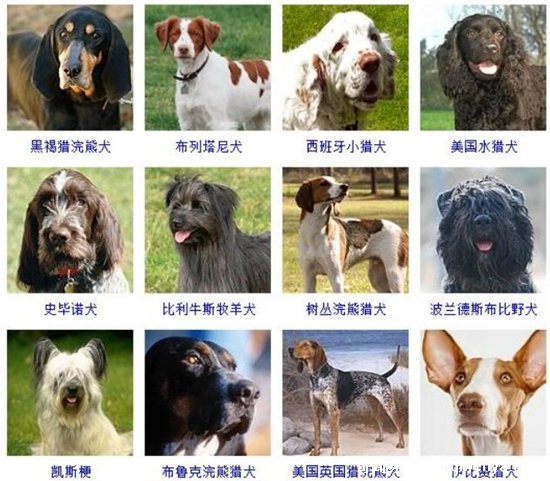 14、黑褐獵浣熊犬、布列塔尼犬、西班牙小獵犬、美國水獵犬、史畢諾犬、比利牛斯牧羊犬、樹叢浣熊獵犬、波蘭德斯布比野犬、凱斯梗、布魯克浣熊獵犬、美國英國獵浣熊犬、伊比贊獵犬;