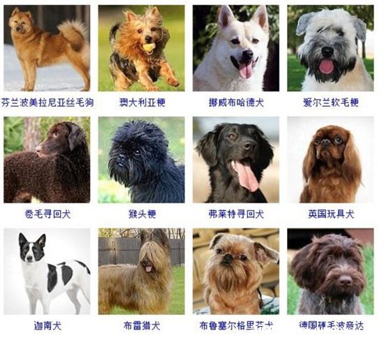 13、芬蘭波美拉尼亞絲毛狗、澳大利亞梗、挪威布哈德犬、愛爾蘭軟毛梗、卷毛尋回犬、猴頭梗、弗萊特尋回犬、英國玩具犬、迦南犬、布雷獵犬、布魯塞爾格里芬犬、德國硬毛波音達;