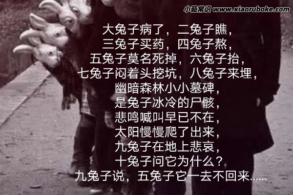 整個童謠每行字居中就是一個墓碑的形狀,反映出生老病死的無奈悲涼之處,十兔子喜歡九兔子,而九兔子和五兔子互相喜歡,十兔子和二兔子很嫉妒,十兔子是大兔子身邊的親信,并對其余兔子的關系了如指掌,他清楚地知道大兔子病了,其余的兔子會怎么干,所以大兔子就指示二兔子讓大兔子生病,綜合前文貫穿整個故事的主線就是十兔子。