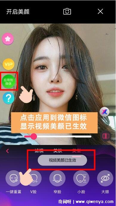 以上就是微信視頻美顏怎么設置的步驟,除了微信自帶的美顏,另外還可以下載微信視頻美顏大師、視頻通話美顏大師等軟件,這些軟件都是可以幫助微信視頻開啟美顏功能的。在微信視頻美顏大師里面的相機功能,打開之后發現不僅可以美顏,還可以進行一些騷操作,對方還可以看到。奇聞呀 wwW.qIwENya.Com