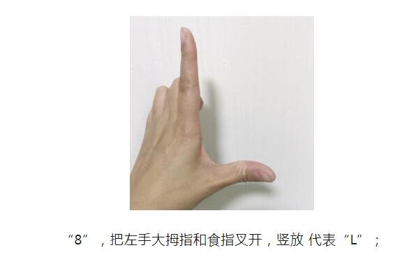1、數字“8”,大拇指和食指叉開,其余手指收回去,在手上豎著放,這就是字母“L”;