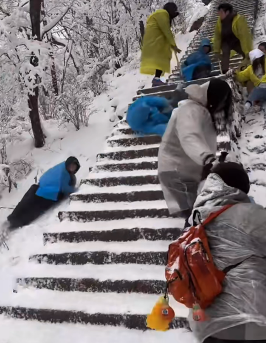 黃山大雪多名游客摔倒,有人頭朝下撞上護(hù)欄,景區(qū):穿冰爪可正常行走,建議雪化了再來