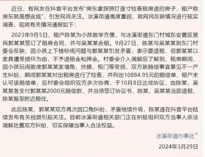 3月29日,江西上饒玉山縣冰溪街道辦事處發布關于網友反映退租糾紛事件的情況通報。通報表示,該租戶糾紛經村委會組織雙方多次協商,于2...