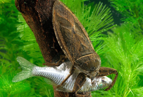 田鱉為半翅目負(fù)子蝽科動(dòng)物,體長通常在7至9厘米間,其中最大的個(gè)體可以長到12厘米,而其中比較小的個(gè)體則只有5厘米左右。田鱉在中國廣泛分布,頭部較小,生活在水中,用位于腹部末端的呼吸管呼吸,喜歡捕食水中的小魚小蟲,當(dāng)田鱉咬到獵物時(shí),它們會(huì)向獵物注射一種可以溶解組織的酶,然后再吸食被液化紅的組織。